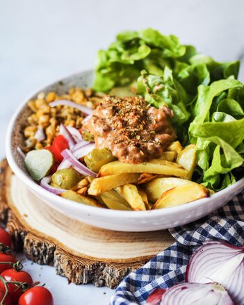 Omyjte salát a rajčata. Salát natrhejte, rajčata rozkrojte napůl, cibuli a okurky nakrájejte na kolečka. Připravte si omáčku na burger (recept zde) a všechny přísady rozdělte do dvou misek. Můžete servírovat!