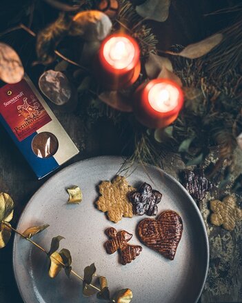 Druhý den zpracujte těsto v rukách rychle tak, aby povolilo, ale nelepilo. Vyválejte na trochu silnější plát než obvykle a do rozváleného těsta vytlačte pomocí válečku vzory: použít můžete krajku, záclonu nebo fólii s motivem dřeva (seženete v cukrářských potřebách). Vykrájejte perníčky a tam, kde budete chtít dekor dřeva, rozmíchejte kakaovou směs a nanášejte (ideálně silikonovou mašlovačkou, jde to s ní nejlíp) na perníčky.