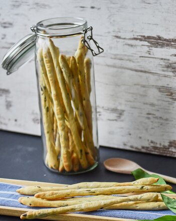 Auf dem Foto sind man mehrere Bärlauch Grissini und frischen Bärlauch. Im Hintergrund steht ein hohes Glas mit Bärlauch Grissinis.  | © SONNENTOR