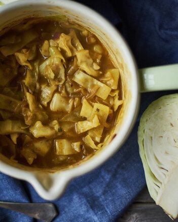 Das Kraut vom Strunk befreien und in rechteckige Stücke schneiden (ca. 1x1 cm). Zwiebel und Knoblauch schälen und in kleine Stücke schneiden. Kokosöl in einem Topf erhitzen, darin das Kraut, Zwiebeln und Knoblauch anrösten. Wenn das Gemüse etwas Farbe bekommen hat, einen Esslöffel Mehl hinzufügen und kurz mitrösten. Mit Gemüsebrühe aufgießen und kräftig umrühren. Eventuell etwas Wasser hinzufügen, das ganze sollte eine sämige Konsistenz bekommen. Mit Curry, Salz und Pfeffer abschmecken.