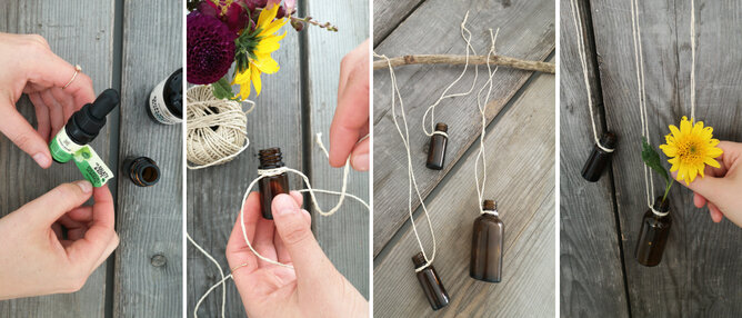 2. Nun die Schnüre je nach gewünschter Länge abschneiden, um den Hals der Fläschchen wickeln und verknoten. Am anderen Ende ebenfalls einen Knoten machen. Die Minivasen können nun auf den Ast gehängt werden.