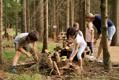 Um den Wald nachhaltig nutzen zu können, folgte als nächster Schritt eine sorgfältige Analyse des Ist-Zustandes: Es galt, die Besonderheiten des Waldes zu entdecken, die passenden Bereiche zu identifizieren und geeignete Materialien auszuwählen. Kaum vorstellbar, dass jede einzelne der 19 Erlebnis-Stationen von der Idee bis zur Umsetzung im Haus bei SONNENTOR entstanden ist. Wir haben viel recherchiert und getüftelt und unsere Betriebsmeister durften ihr handwerkliches Geschick unter Beweis stellen. Das Ergebnis kann sich sehen lassen: Einzigartige Stationen, die auf charmante und spielerische Art und Weise in das Ökosystem Wald eintauchen lassen. So können es sich unsere Gäste unter anderem bei einer kostenlosen Fußmassage auf dem weichen Waldteppich und Entspannung mit Waldyoga-Anleitungen im Wald-Reich richtig gut gehen lassen. Eine zauberhafte Märchen-Station lädt zum Ratespiel ein, ein Waldfoto mit Zapfenbart und Waldperücke erinnert noch lange an das gemeinsame Abenteuer. Und apropos Abenteuer: Auch die olympischen Spiele haben wir kurzerhand ins Grüne verlegt. Disziplinen wie „Zapfenzielwurf“, „Tierisch auf Zack“ und „Waldhüpfer“ fordern die ganze Familie heraus. Rätsel-Fans und Wissensdurstige erfahren im Wald-Reich, welche Wildkräuter und Früchte im Wald zu finden sind, wie Bäume sprechen, wer der trommelnde Zimmermann des Waldes ist oder warum Ordnung bei Totholz fehl am Platz ist.
